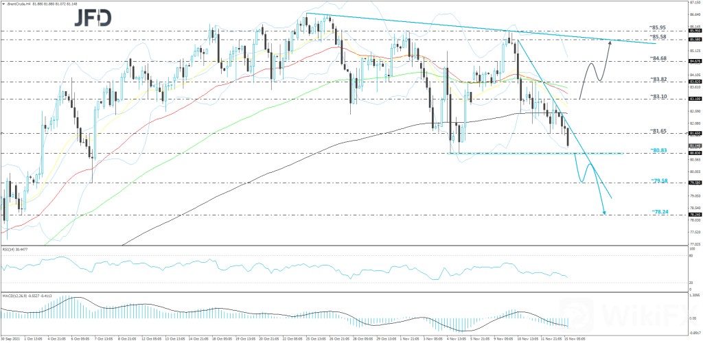 In other way round, when the price breaks above the aforementioned downside line and then climbs above the 83.10 barrier, marked by the high of November 12th, that could attract a few more buyers into the game. Brent oil might then travel to the 83.82 obstacle, or even to the 84.68 territory, which is marked near an intraday swing high of November 9th and an intraday swing low of November 10th. If the buying fails to stop there, the next possible target could be the 85.58 level, marked by an intraday swing high of November 10th. Over there the commodity may test a short-term uncertain downside resistance line drawn from the high of October 25th, and it may likely provide an additional hold-up.